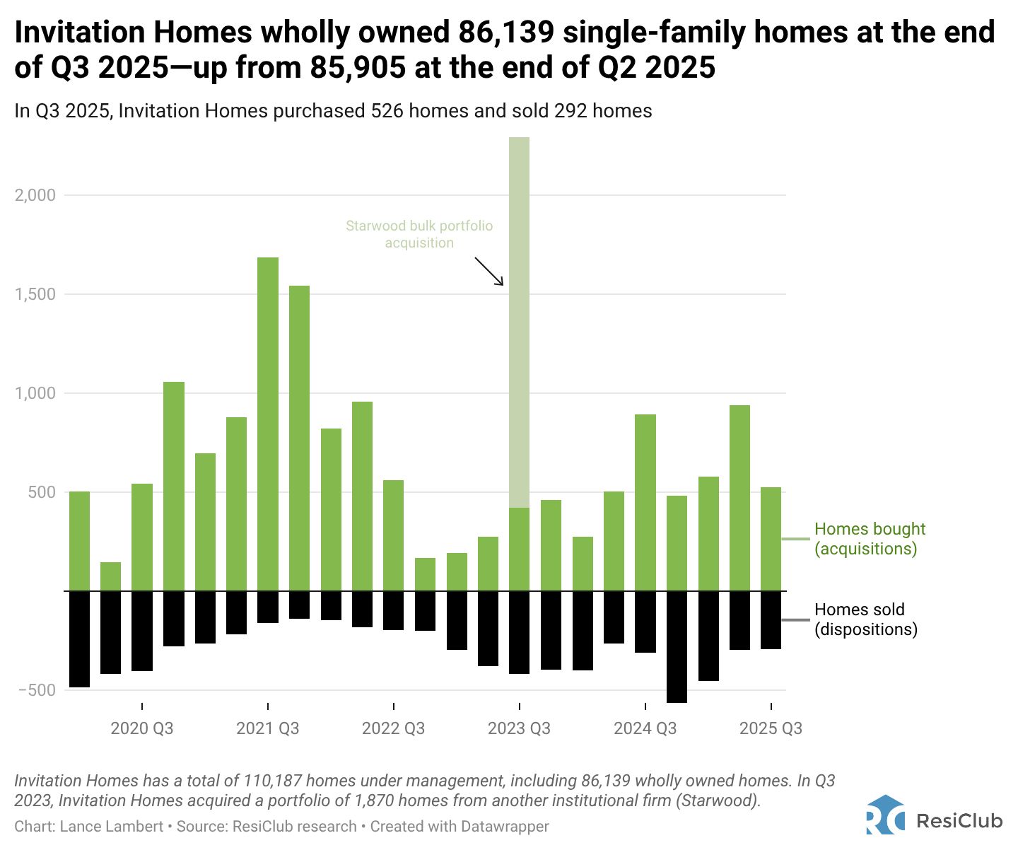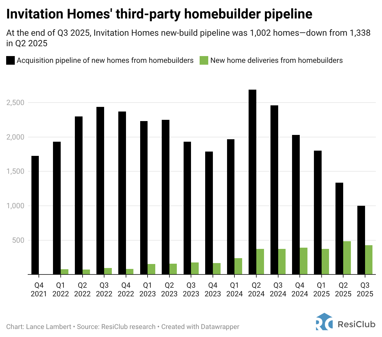 Back in 2021, Invitation Homes struck a deal with PulteGroup and began buying build-to-rent homes. In Q3 2025, third-party homebuilders delivered 426 homes to Invitation Homes—and have another 1,002 in the pipeline (see chart above).