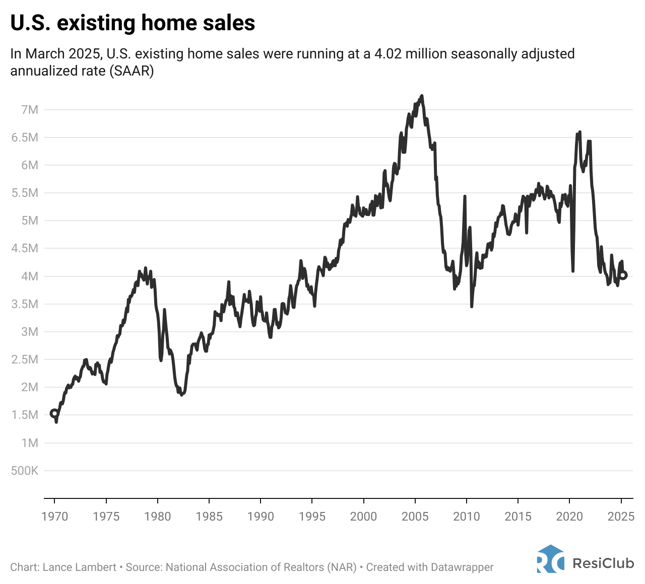 In March 2025, U.S. existing home sales were running at a 4.02 million seasonally adjusted annualized rate (SAAR).
