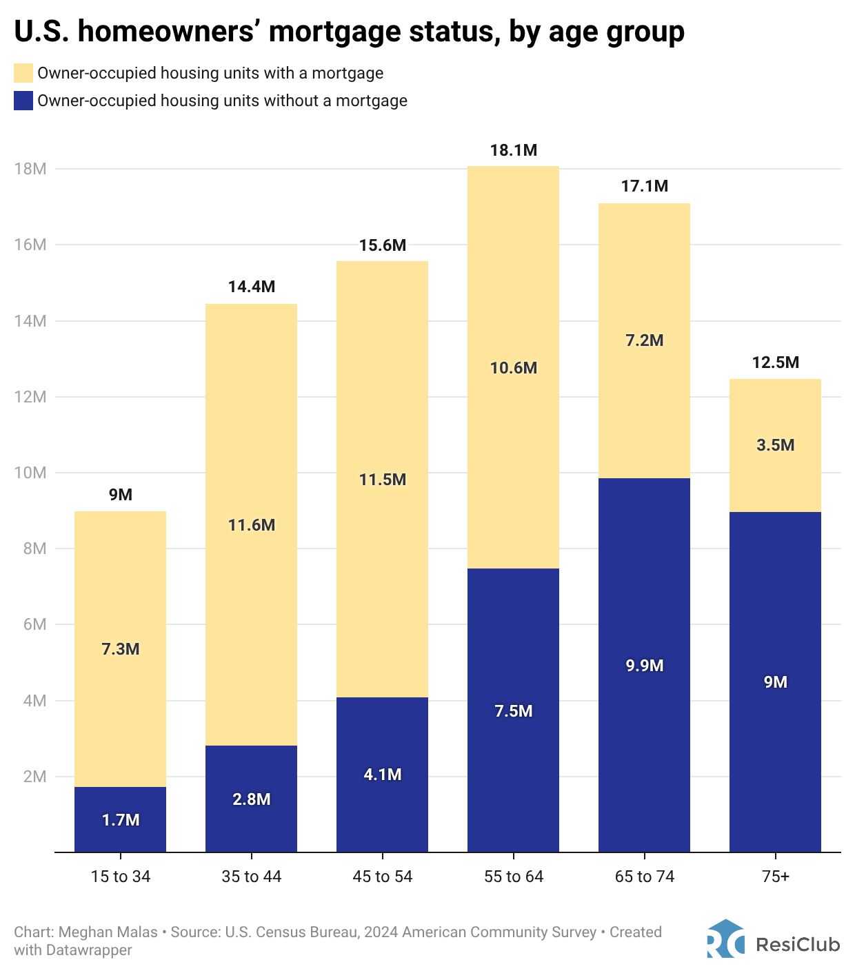 Around 40% of U.S. homeowners are mortgage-free—up from 33% in 2010. One major driver is that the U.S. population is aging as the large Baby Boomer generation grows older and fertility rates decline. Older Americans, of course, are more likely to own their homes outright.