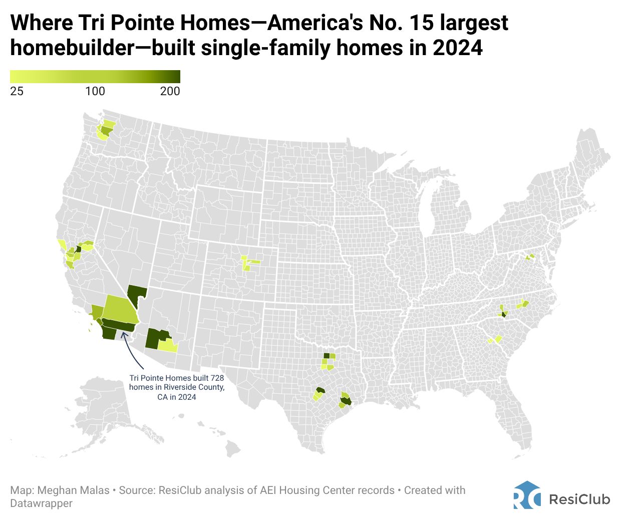 Pulling from the ResiClub Terminal—where our clients can find the local footprints of America’s largest homebuilders going back over a decade—we can see that Tri Pointe Homes’ biggest concentrations are in markets like L.A., Sacramento, Seattle, the Texas Triangle, Phoenix, and Las Vegas. In recent months, Tri Pointe Homes has also begun expanding into Florida (New Smyrna Beach).