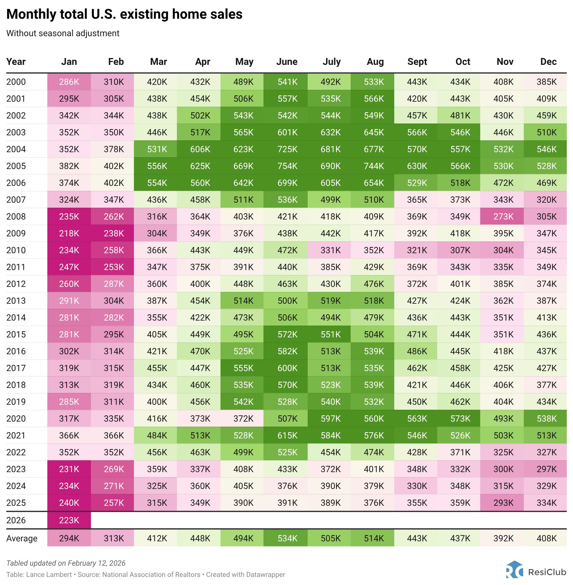 U.S. existing home sales totaled 223K in January 2026. Simply put, turnover still remains strained in the existing-home market.