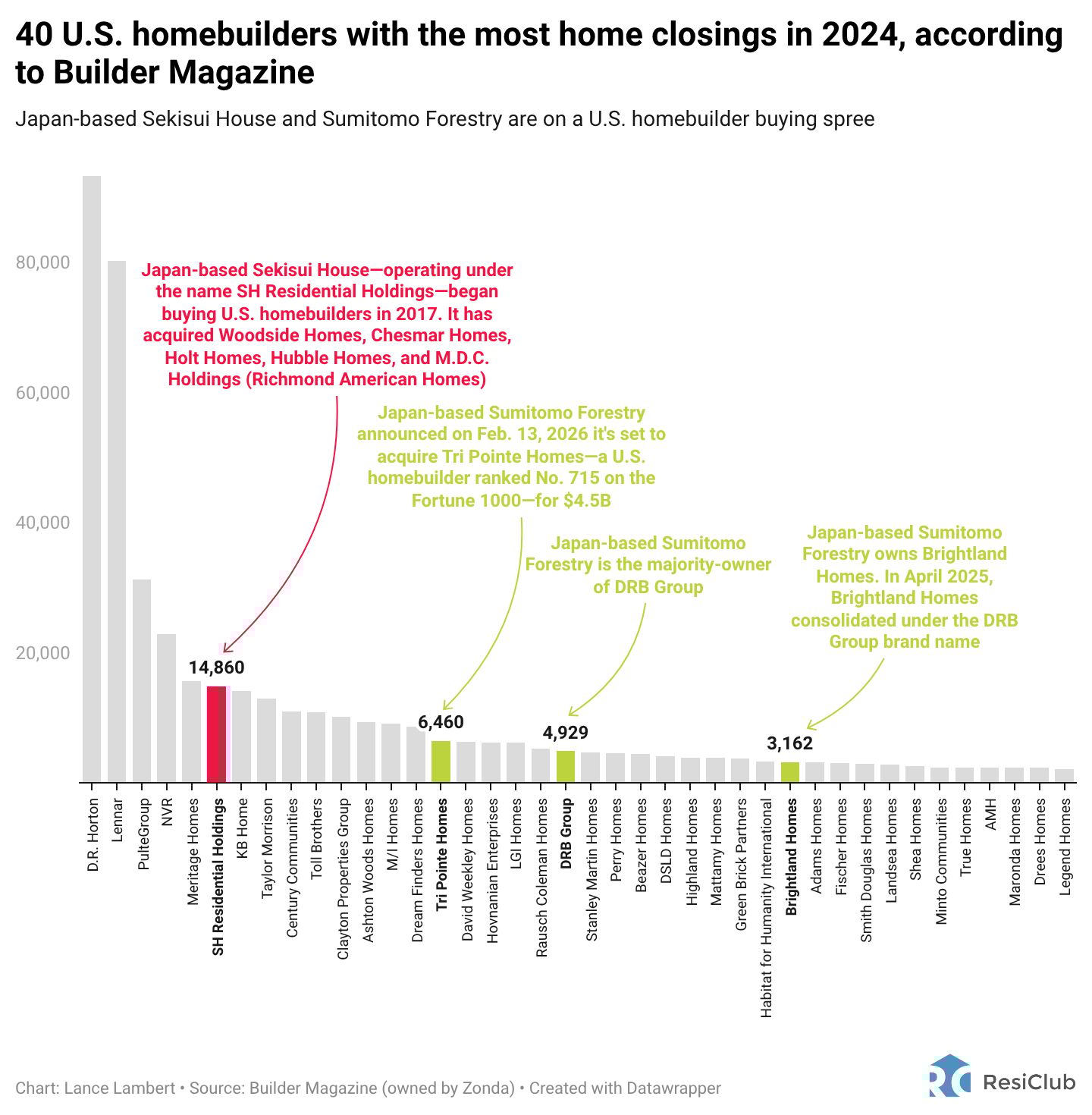 Sumitomo Forestry 🏡 🇯🇵 —> For Sumitomo Forestry—a Japan-based forestry, timber, and homebuilding company—this Tri Pointe Homes acquisition meaningfully accelerates its U.S. expansion goals, including its stated target of delivering 23,000 homes annually in the U.S. by 2030. In 2016, Sumitomo Forestry became the majority owner of DRB Group (America’s No. 20 largest homebuilder). In April 2025, Brightland Homes (America’s No. 24 largest homebuilder—which Sumitomo Forestry acquired a majority stake of in 2016) consolidated into DRB Group.