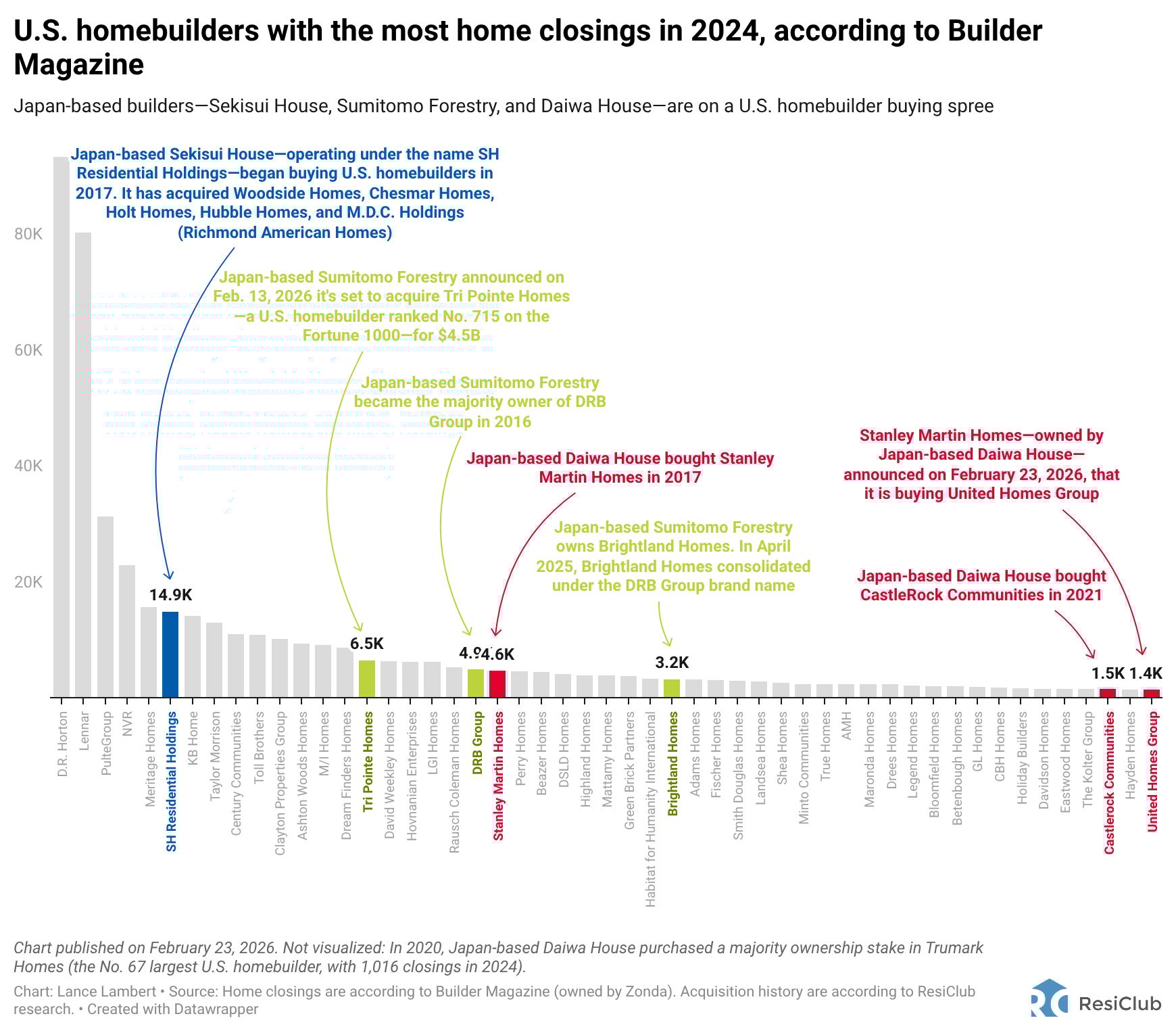 Just 10 days ago, on February 10, Japan-based Sumitomo Forestry announced that it had agreed to acquire Tri Pointe Homes—a large U.S. homebuilder ranked No. 715 on the Fortune 1000—for $4.5 billion, signaling that Japanese builders were further accelerating their buying spree of U.S. homebuilders.