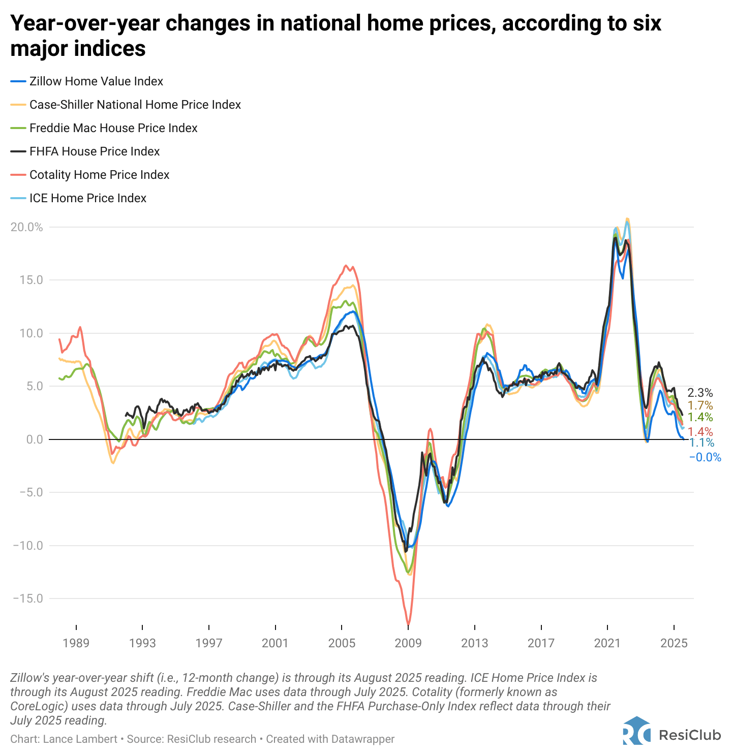 On a year-over-year basis, nationally aggregated home prices have been softening this year across the 6 major indices tracked by ResiClub.