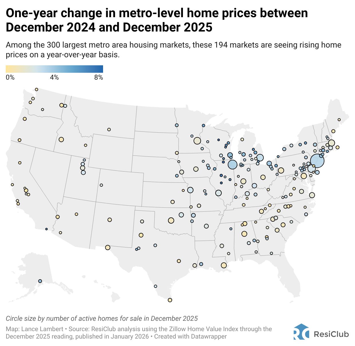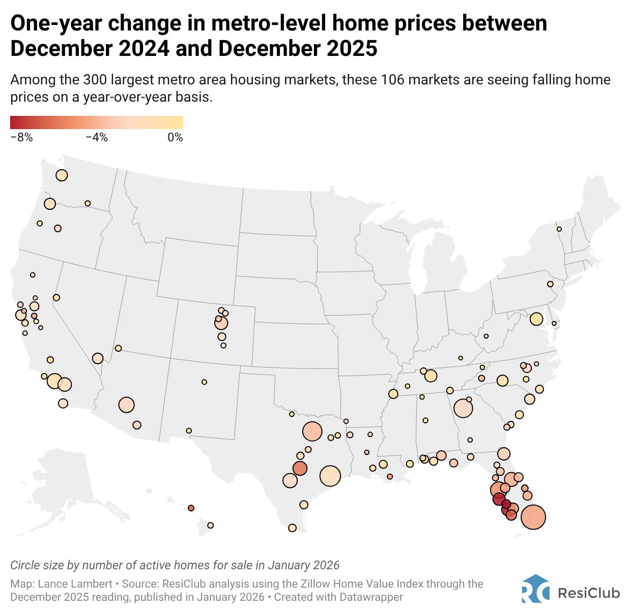 106 of the nation’s 300 largest housing markets (i.e., 35% of markets) had a falling year-over-year reading in the Dec. 2024 to Dec. 2025 window.