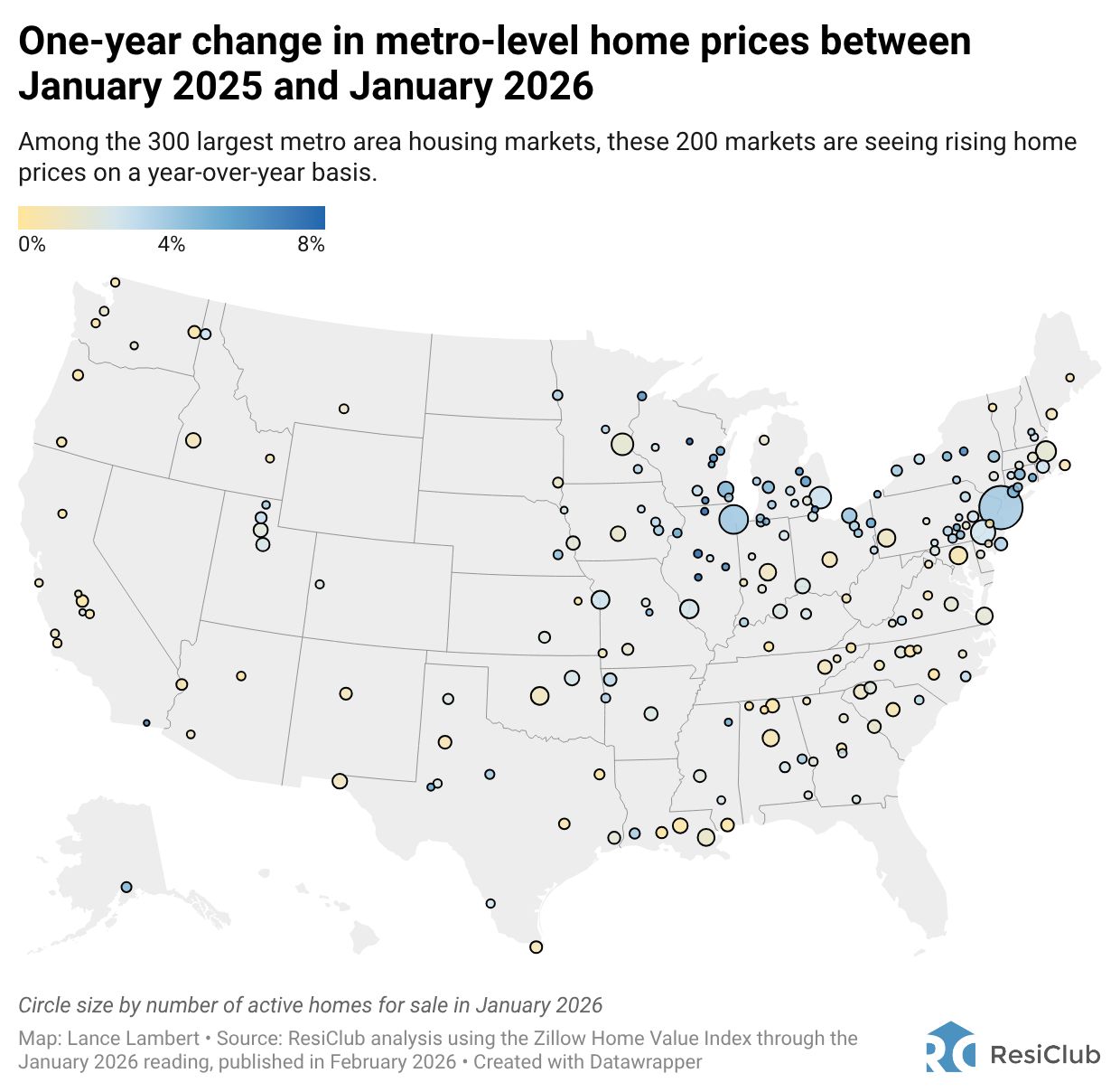 100 of the nation’s 300 largest housing markets (i.e., 33% of markets) had a falling year-over-year reading in the Jan. 2025 to Jan. 2026 window.