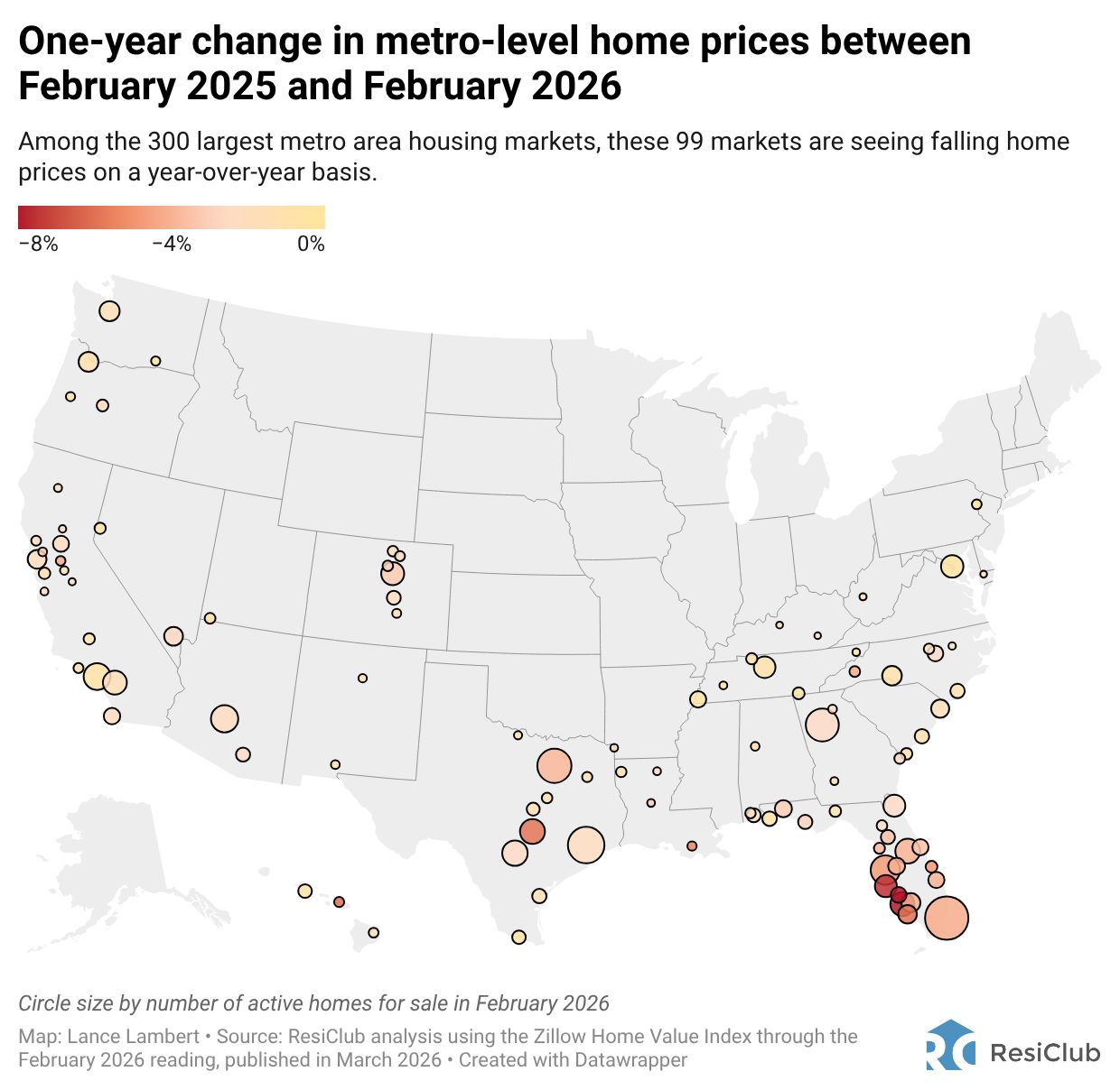 99 of the nation’s 300 largest housing markets (i.e., 33% of markets) had a falling year-over-year reading in the Feb. 2025 to Feb. 2026 window.
