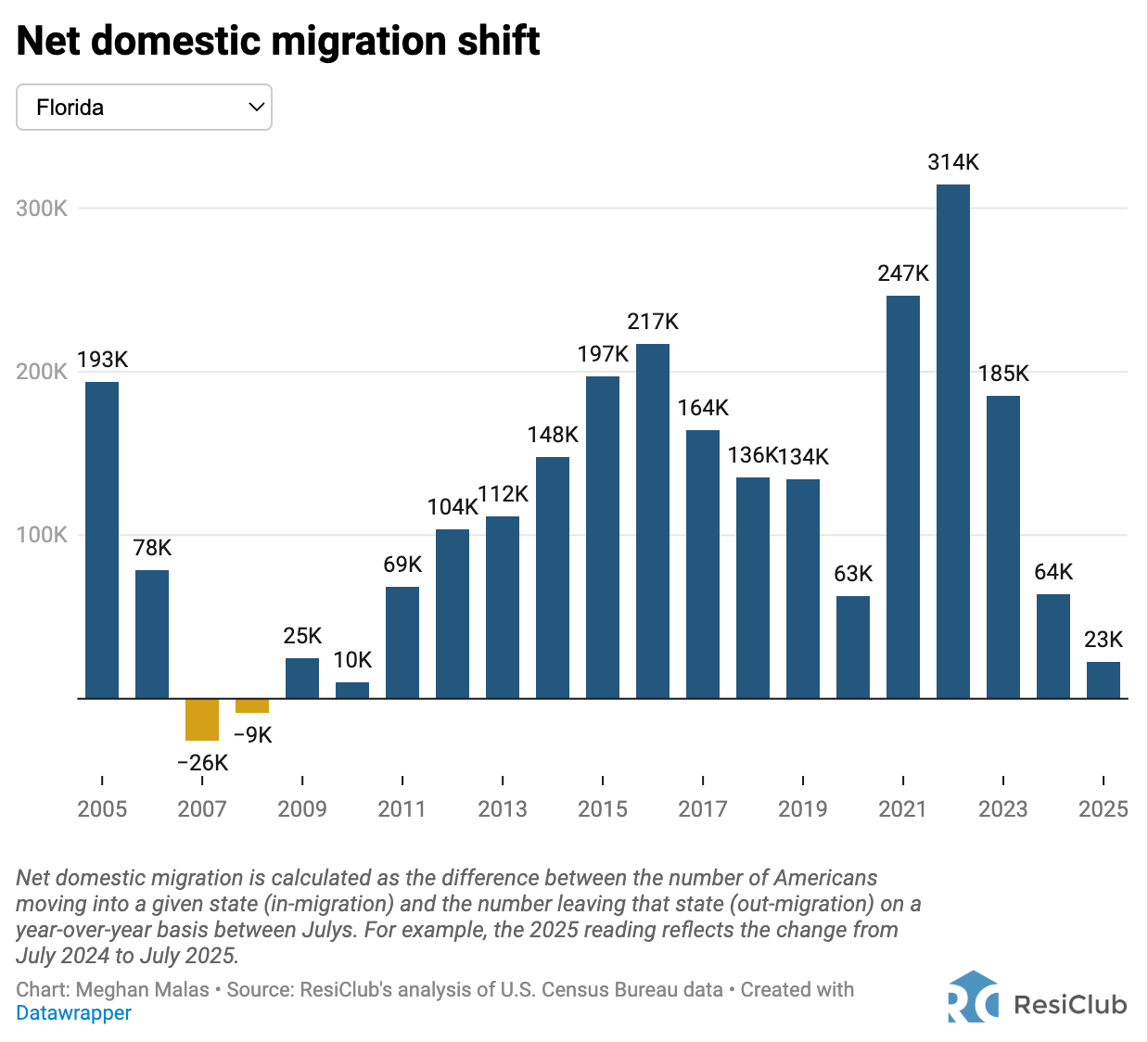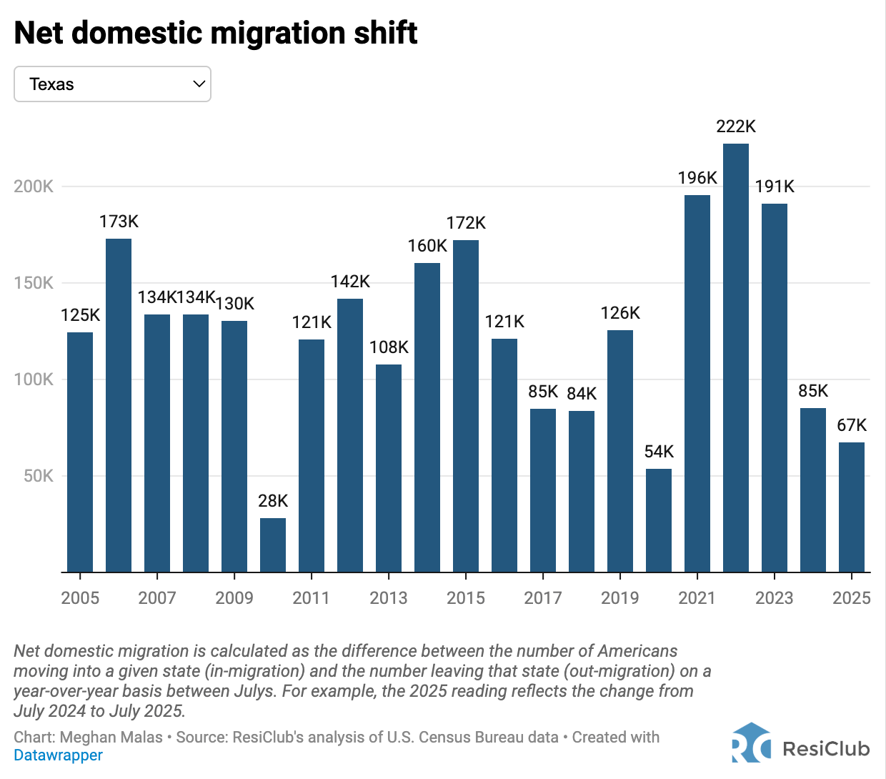 Indeed, Florida saw net domestic migration of +23K in 2025, compared to +314K in 2022, while Texas saw net domestic migration of +67K in 2025, compared to +222K in 2022.