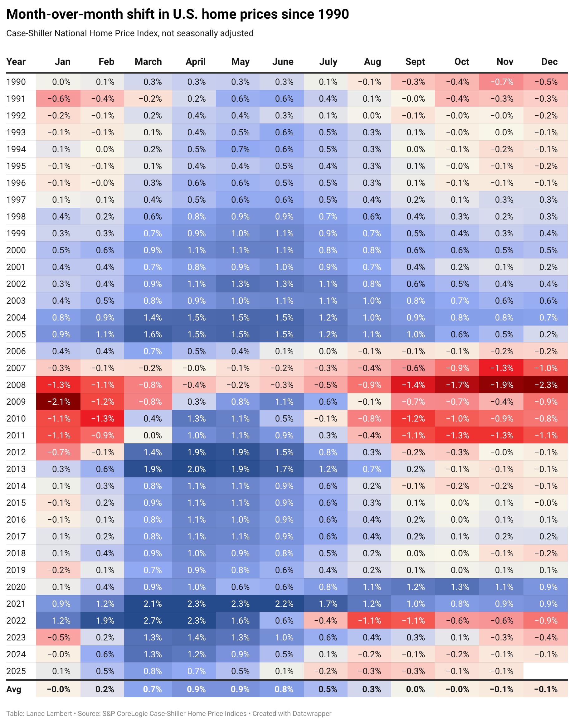 Today, we learned that U.S. home prices, as measured by the Case-Shiller National Home Price Index, fell -0.1% month-over-month from the October 2025 reading to the November 2025 reading. Seasonally, that decline is fairly normal for that time of year—which is at the tail end of the typical seasonal softening window.
