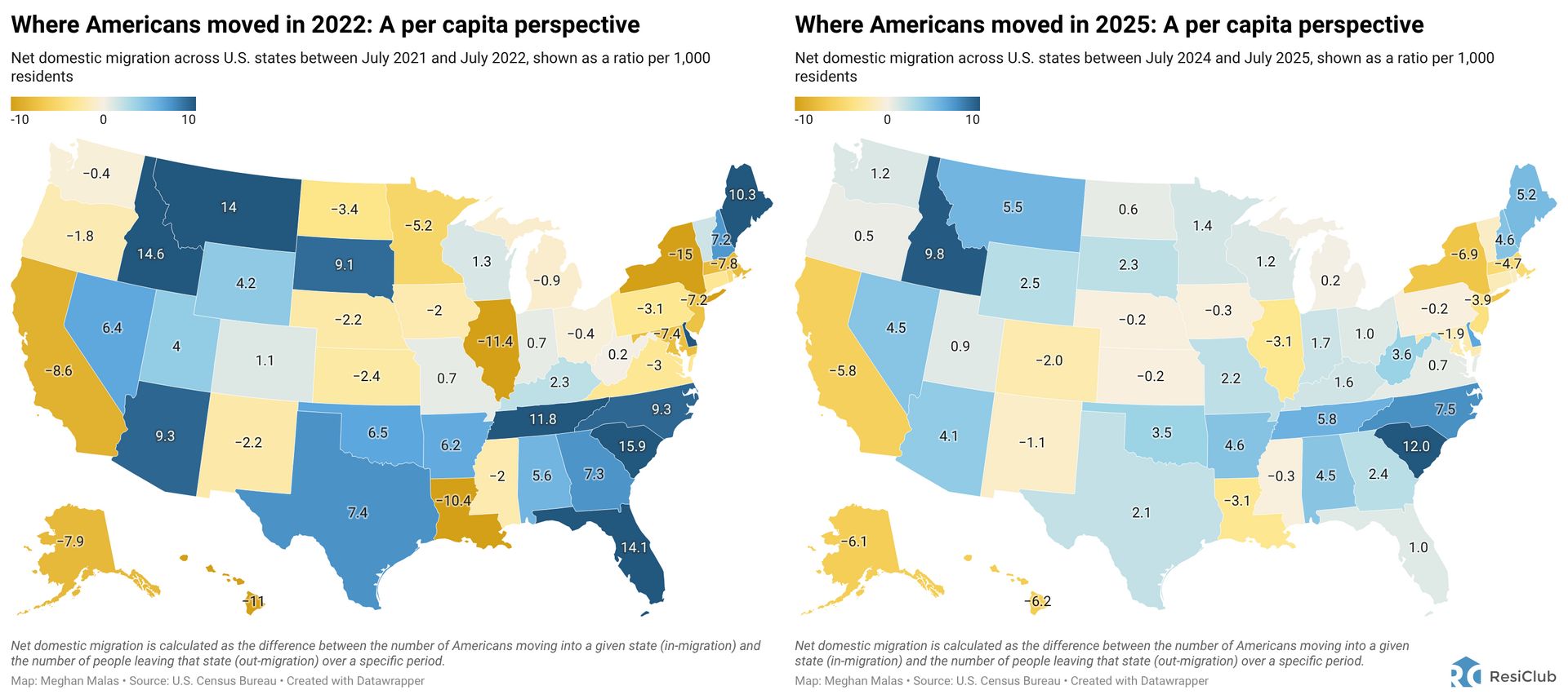 To make a more apples-to-apples comparison, ResiClub takes the Census data and calculates net domestic migration on a per-capita basis—measured as net domestic migration per 1,000 state residents. Viewed this way, South Carolina, Idaho, and North Carolina emerge as the top destinations for net domestic migration.