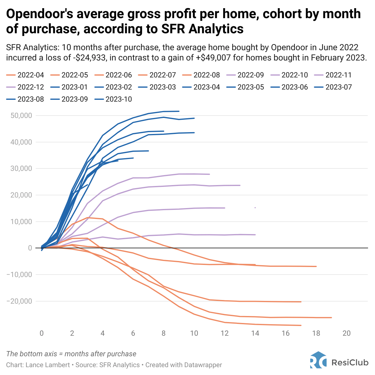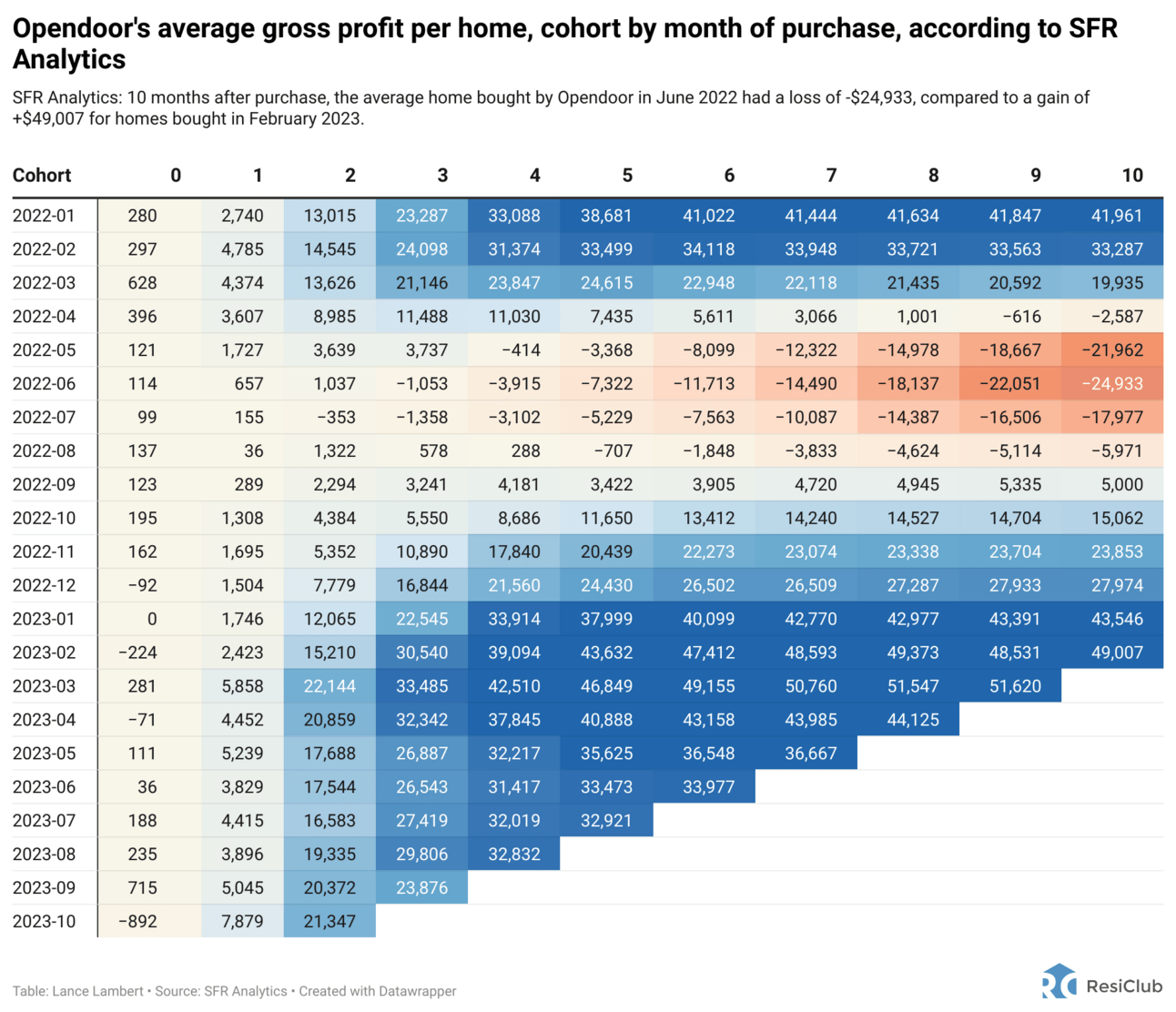 According to data SFR Analytics provided to ResiClub, ten months after the purchase, the average home bought by Opendoor in June 2022 incurred a loss of -$24,933. In contrast, the average home acquired by Opendoor in February 2023 experienced a gain of +$49,007 by the ten-month mark.