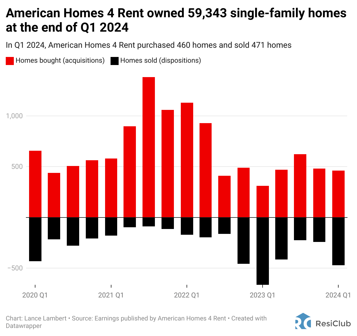 In Q1 2024, American Homes 4 Rent purchased 460 homes and sold 471 homes. (Of those 460 purchases, 441 were newly constructed homes via their in-house build-for-rent program).