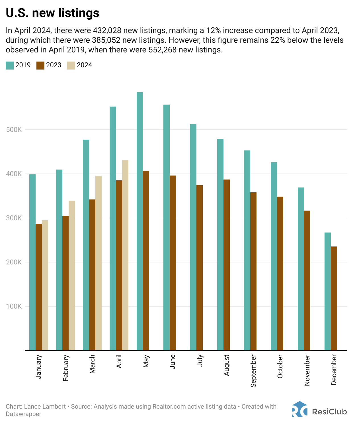 Indeed, in April 2024, there were 432,028 U.S. new listings, marking a +12% increase compared to April 2023, during which there were 385,052 U.S. new listings. However, this figure remains -22% below the levels observed in April 2019, when there were 552,268 U.S. new listings.
