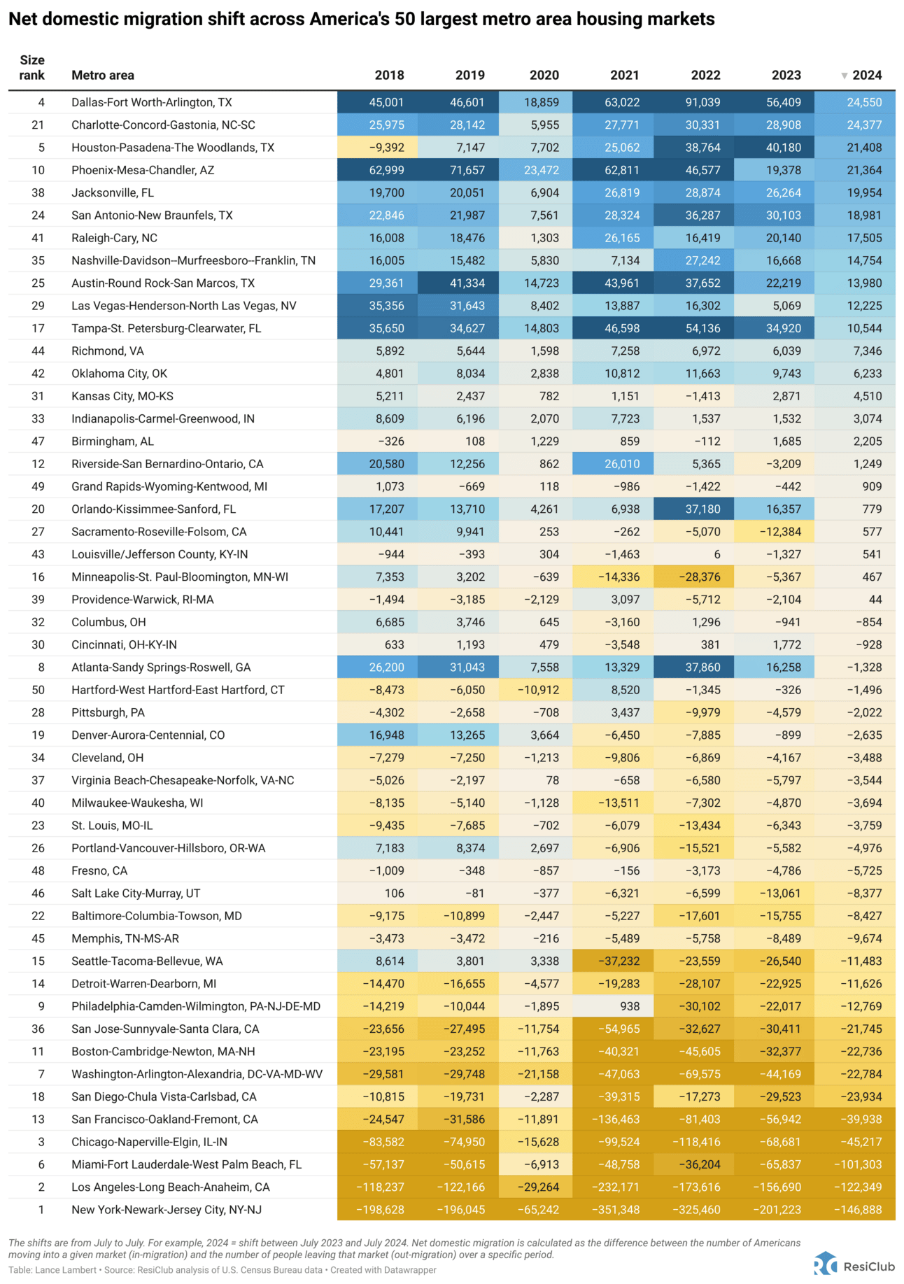 The table below shows net DOMESTIC migration shifts in America’s 50 largest metro area housing markets.