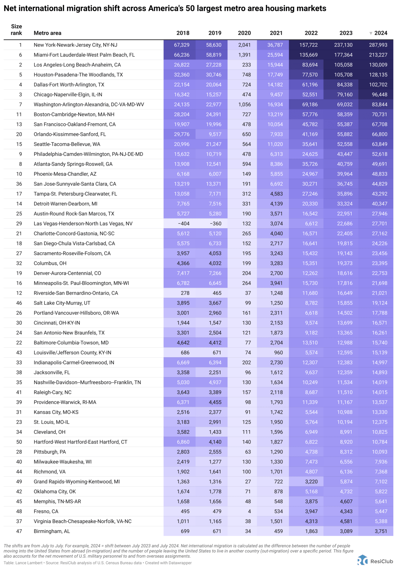 ResiClub PRO members can access our full net international migration report, which includes 17 charts and maps, as well as analysis for over 800+ metros and 3,000+ counties.