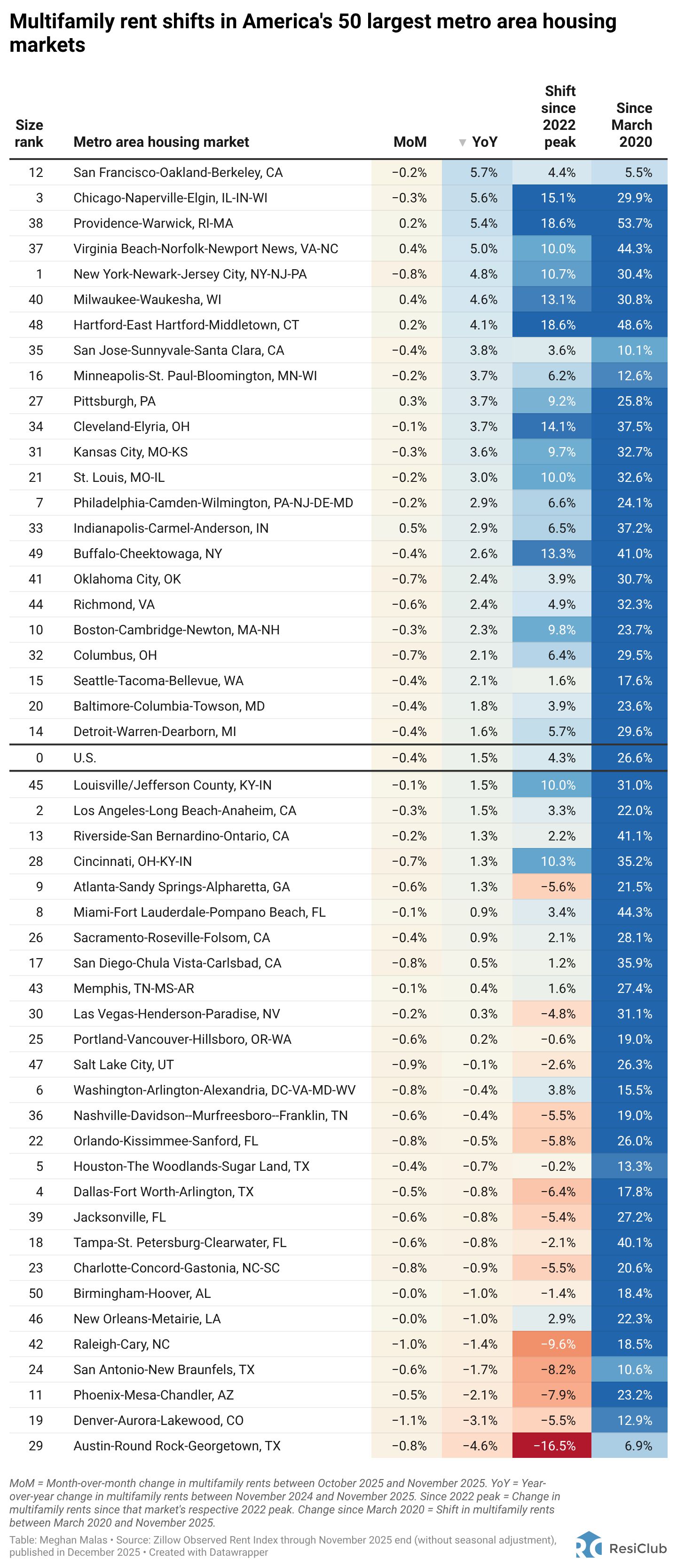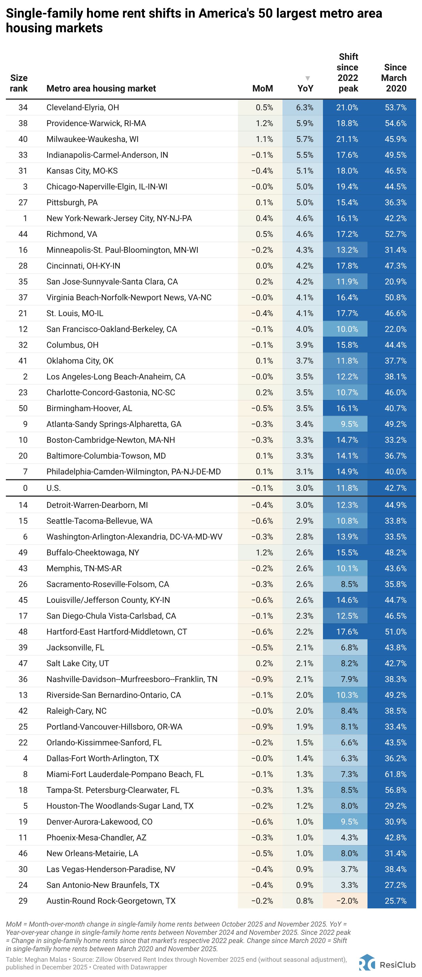 To better understand housing and rental dynamics across the country, today’s issue includes four tables showing year-over-year changes in single-family rents, multifamily rents, single-family home prices, and condo home prices across America’s 50 largest metro housing markets. ResiClub’s analysis uses Zillow data.