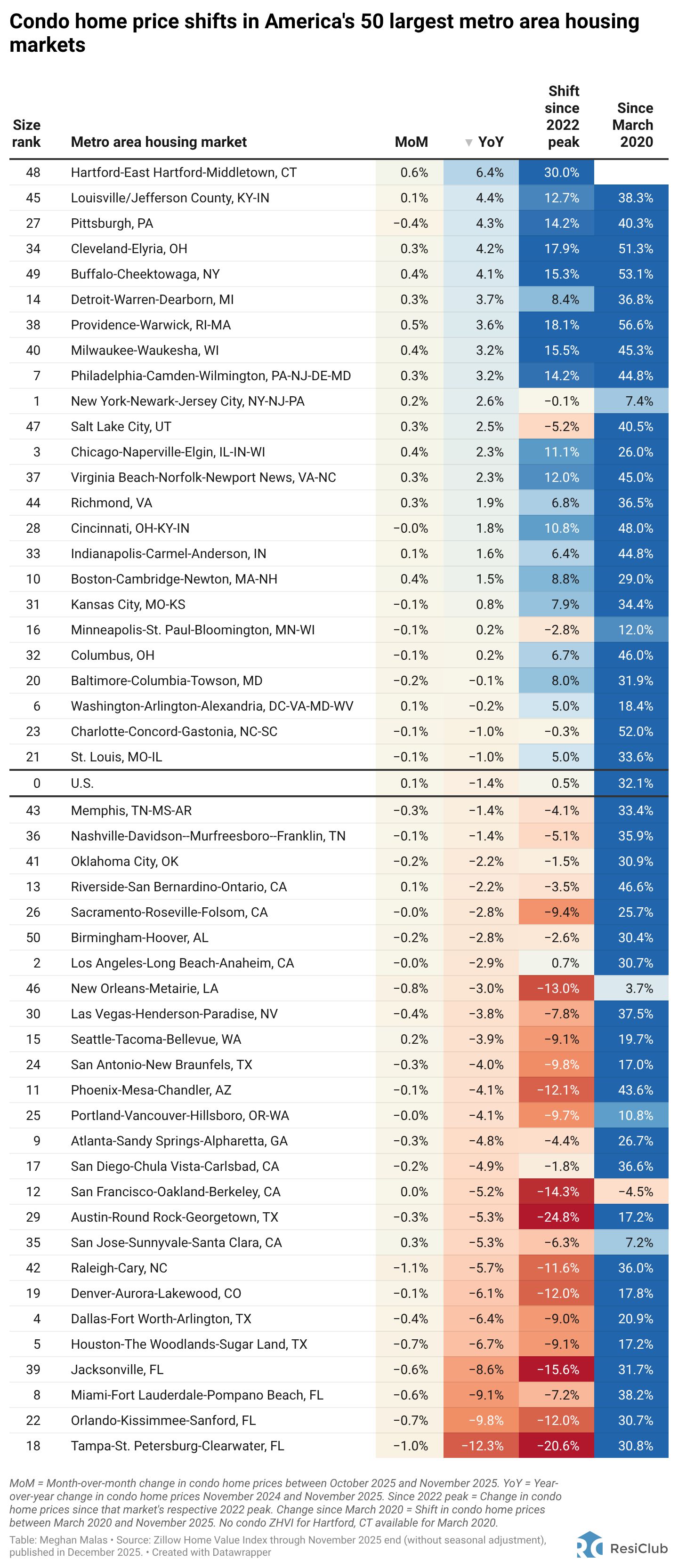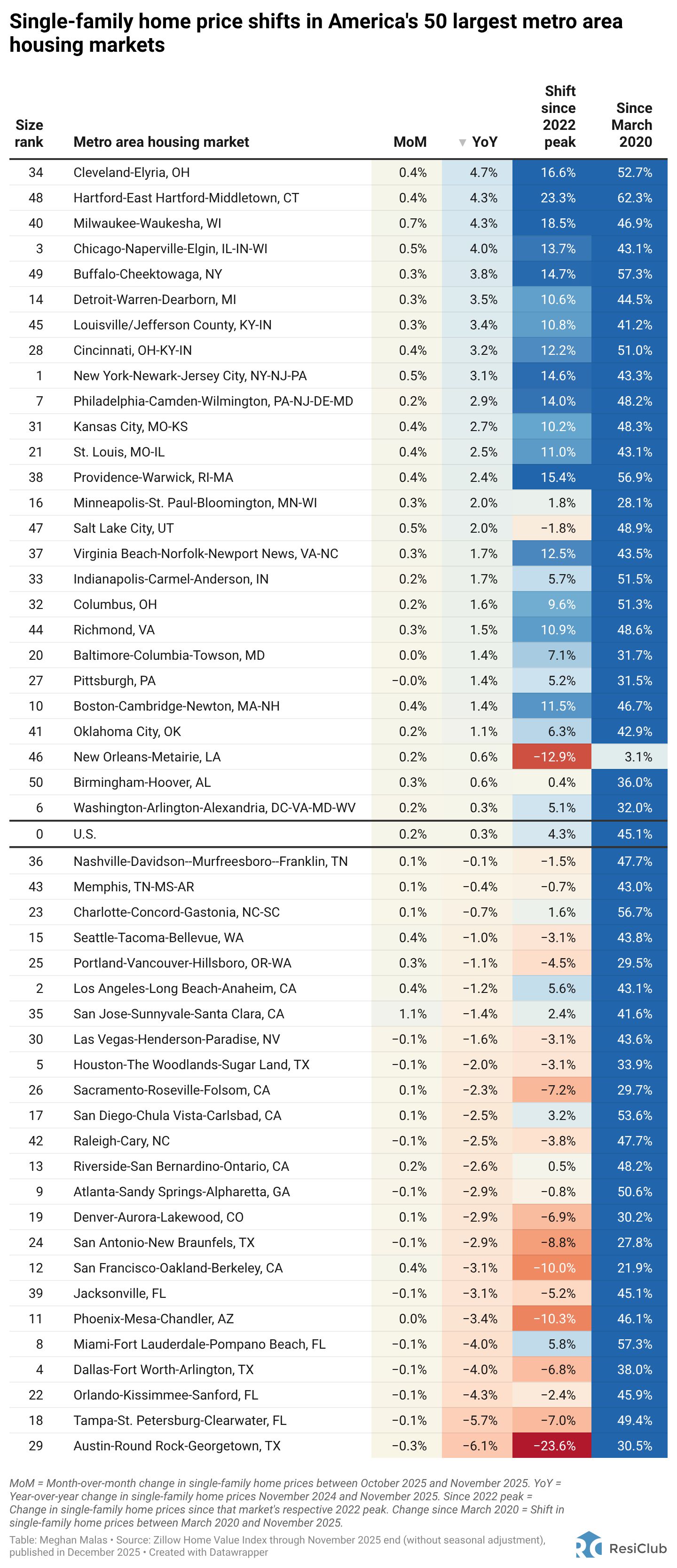 Every month, we send our ResiClub members a table showing home price shifts—including single-family and condos—across America’s largest metro area housing markets.