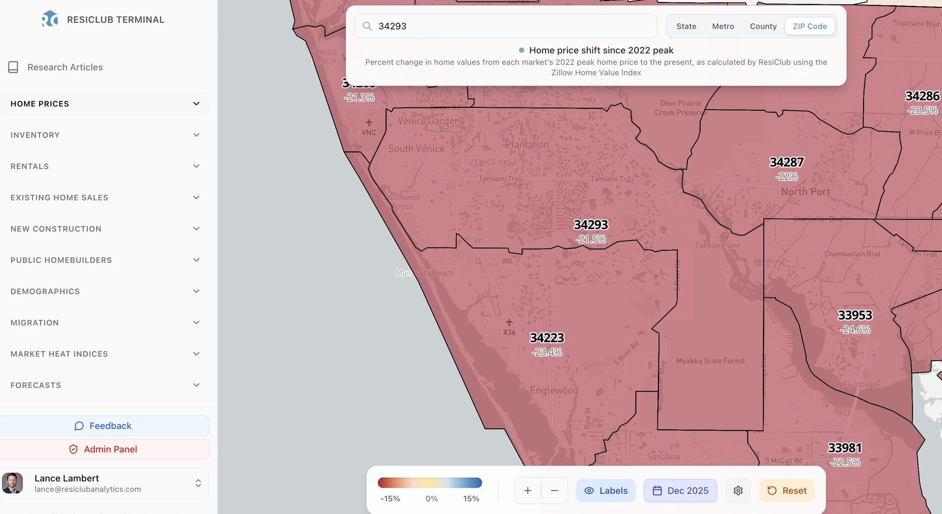 Pulling from the ResiClub Terminal, single-family home prices in the ZIP Code highlighted in today’s article (34293) are down -11.3% year-over-year.