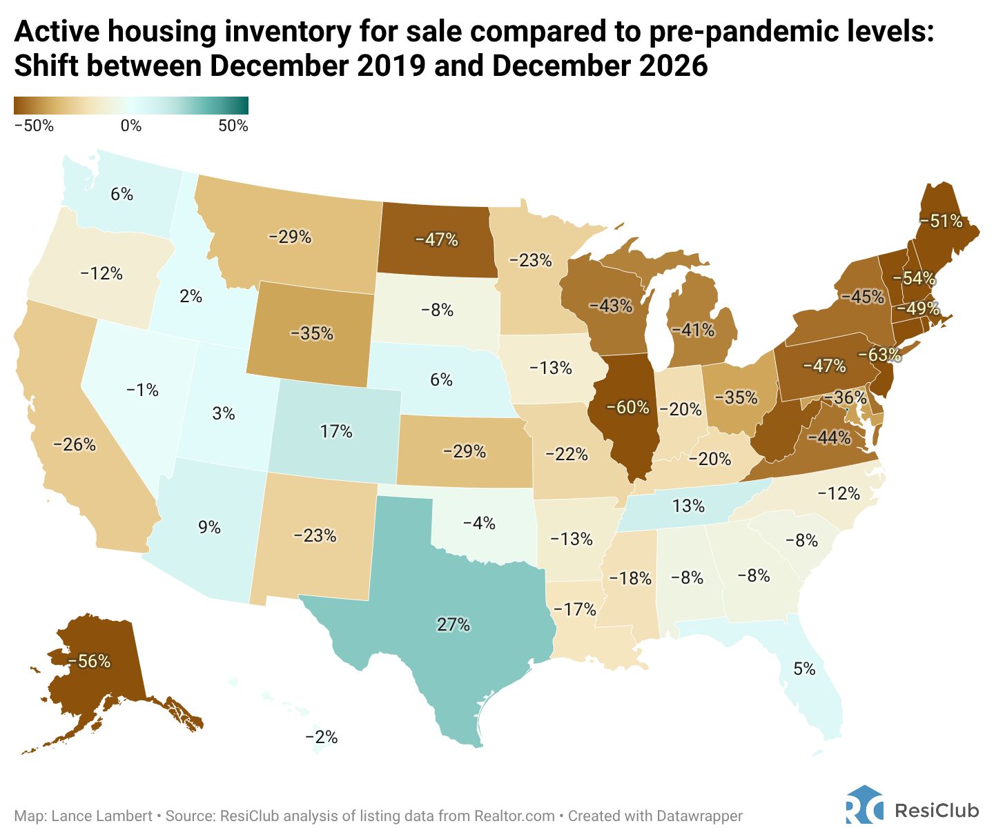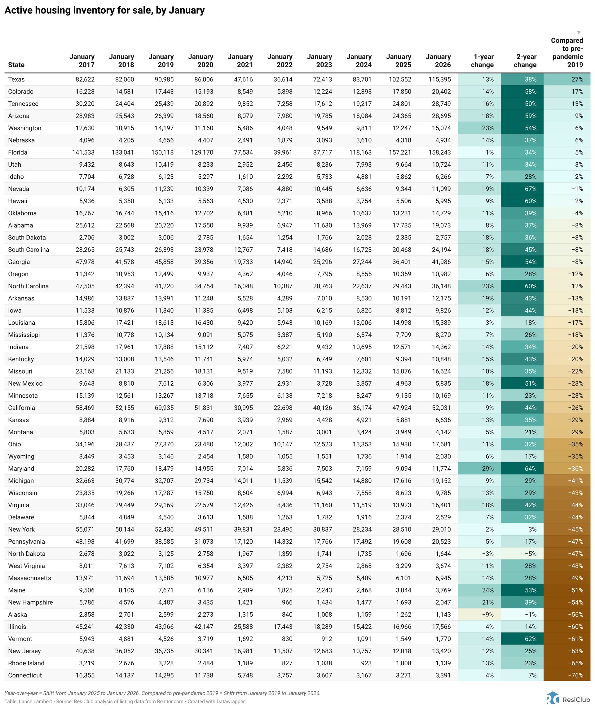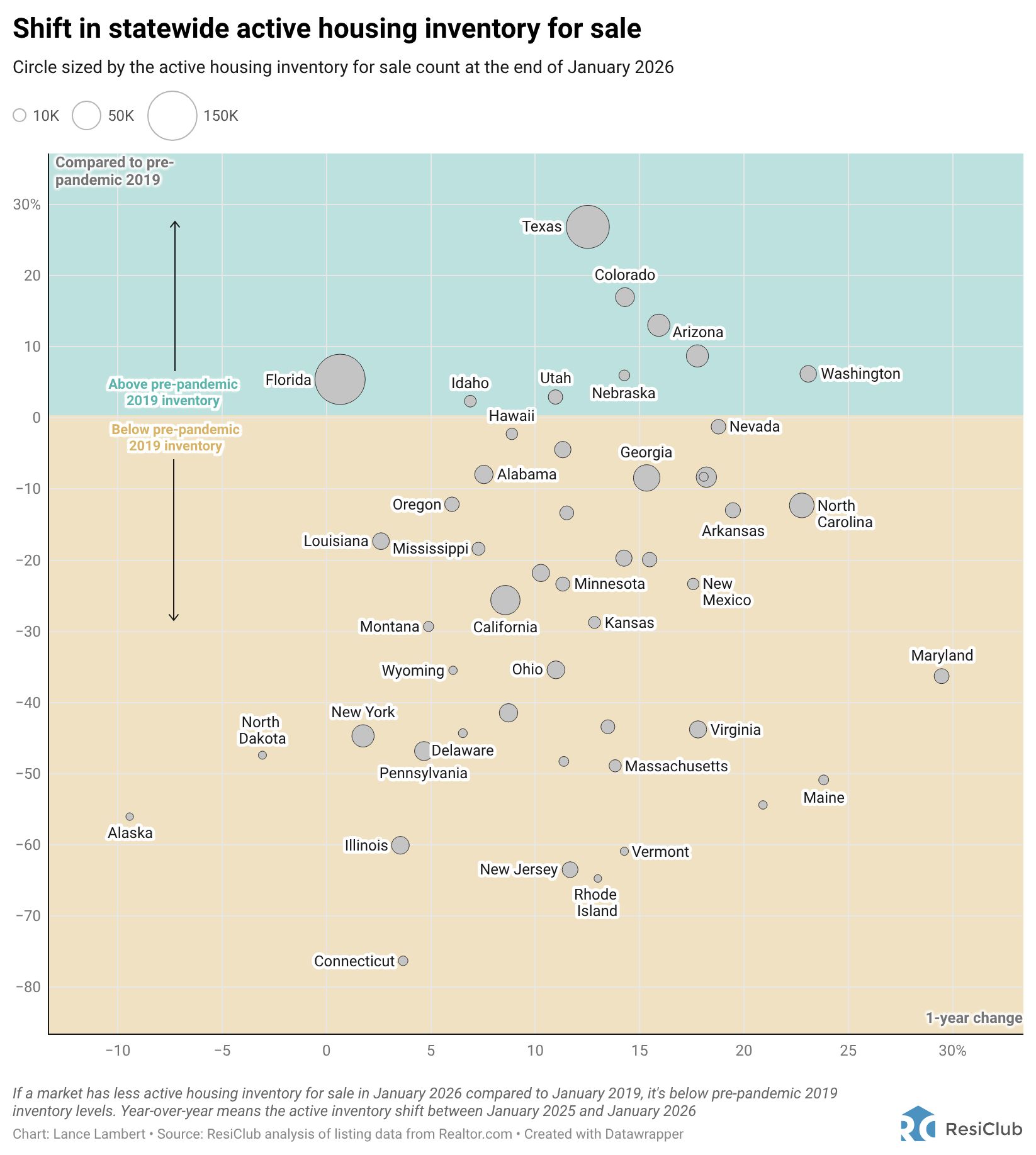 Right now, we’re looking at state inventory data. Tomorrow, ResiClub members (paid tiers) will get our monthly interactive deep dive analysis looking at inventory shifts and signals for over 800 metro areas, 3,000 counties, and 25,000 ZIP codes.