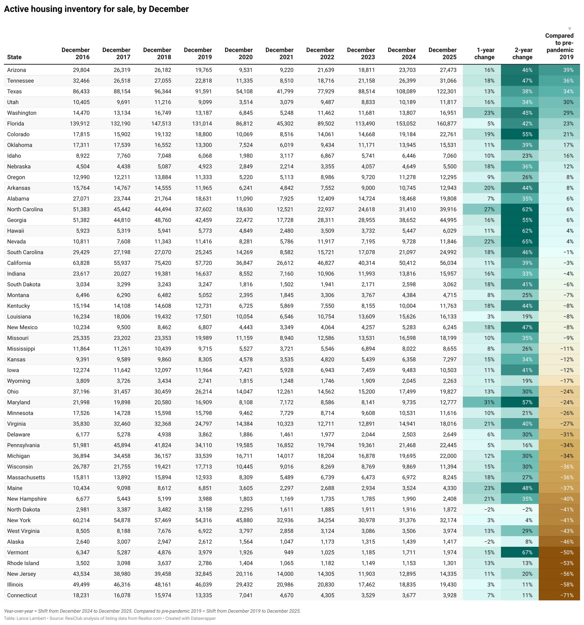 Right now, we’re looking at state inventory data. Tomorrow, ResiClub members (paid tier) will get our monthly interactive deep dive analysis looking at inventory shifts and signals for over 800 metro areas, 3,000 counties, and 25,000 ZIP codes.