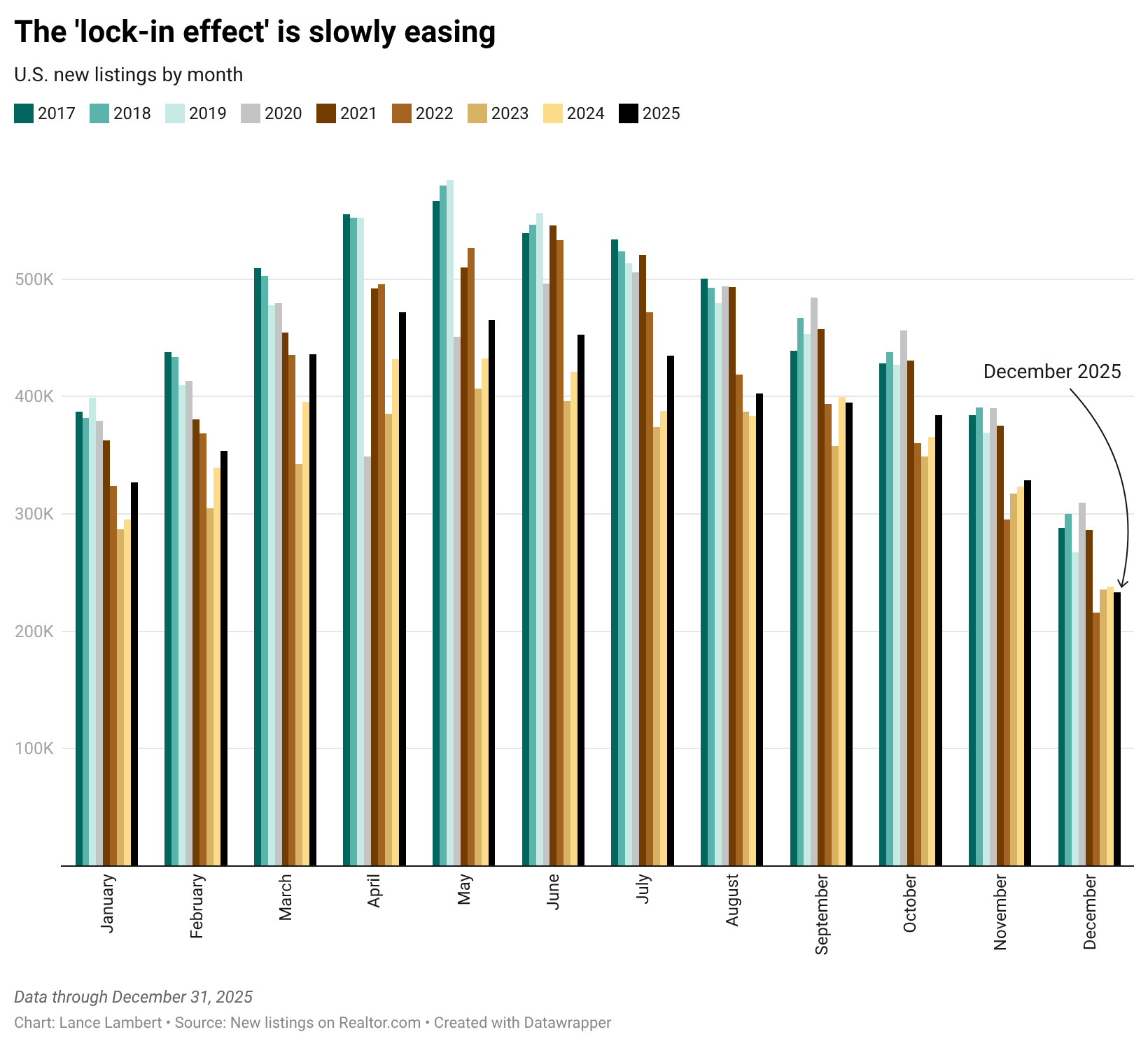 Look at the number of new listings in 2025—it’s higher than in 2023 and 2024. However, it hasn’t yet translated into a noticeable uptick in existing home sales.