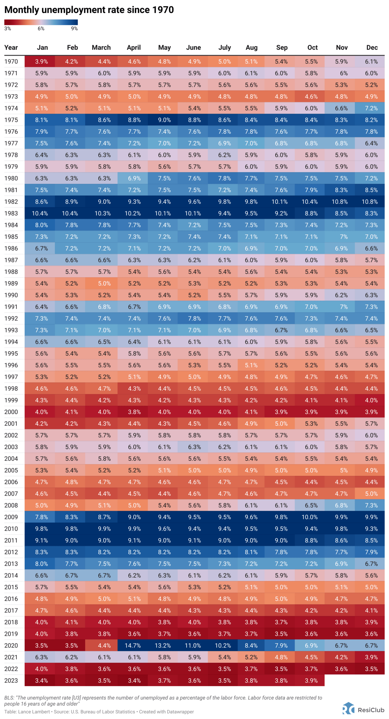 To understand just how resilient the U.S. labor market has been, let's examine the historical data. The chart below illustrates the monthly unemployment rate dating back to 1970.