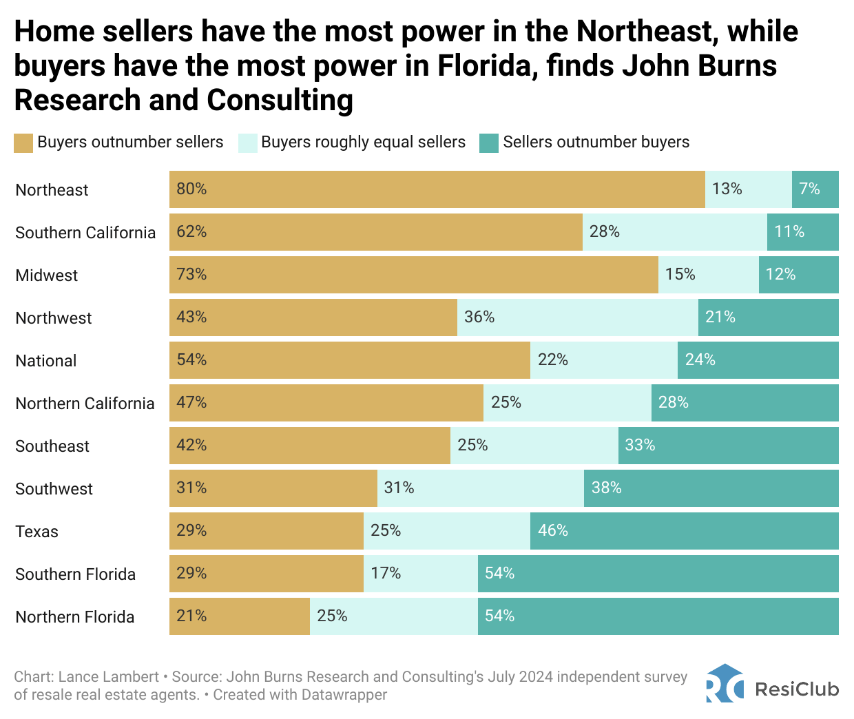 Home sellers in the Northeast, Midwest, and Southern California, have the most power, while home buyers in Florida and Texas have the most power.