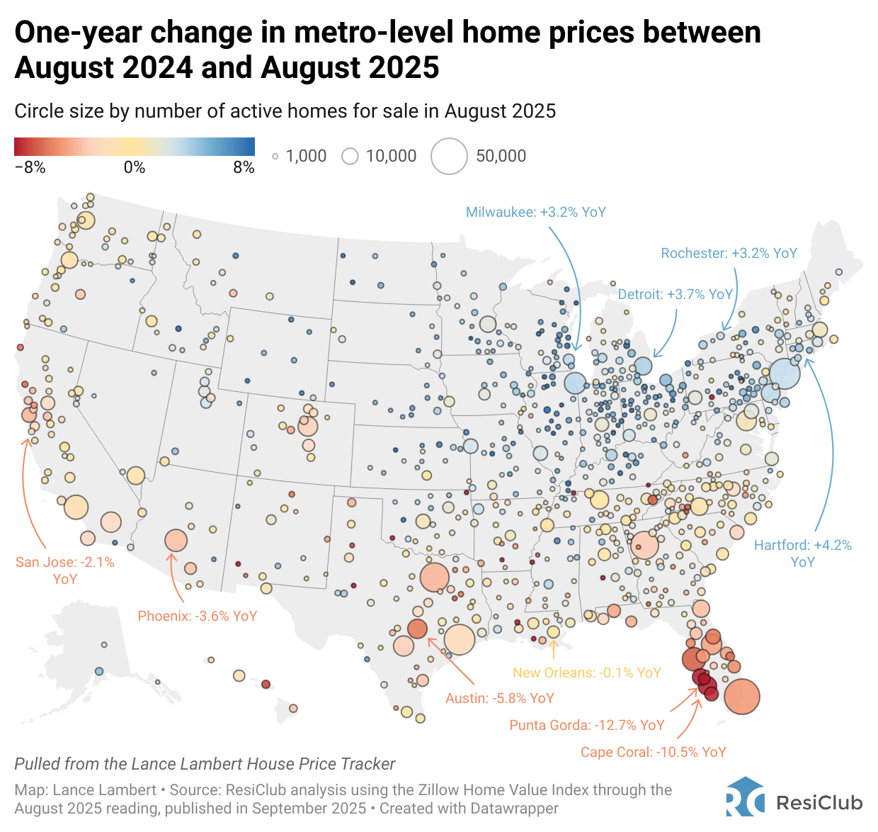 Below is what the current year-over-year rate of home price growth looks like for single-family and condo home prices. The Sun Belt, in particular Southwest Florida, has been the epicenter of housing market softness over the past two years.